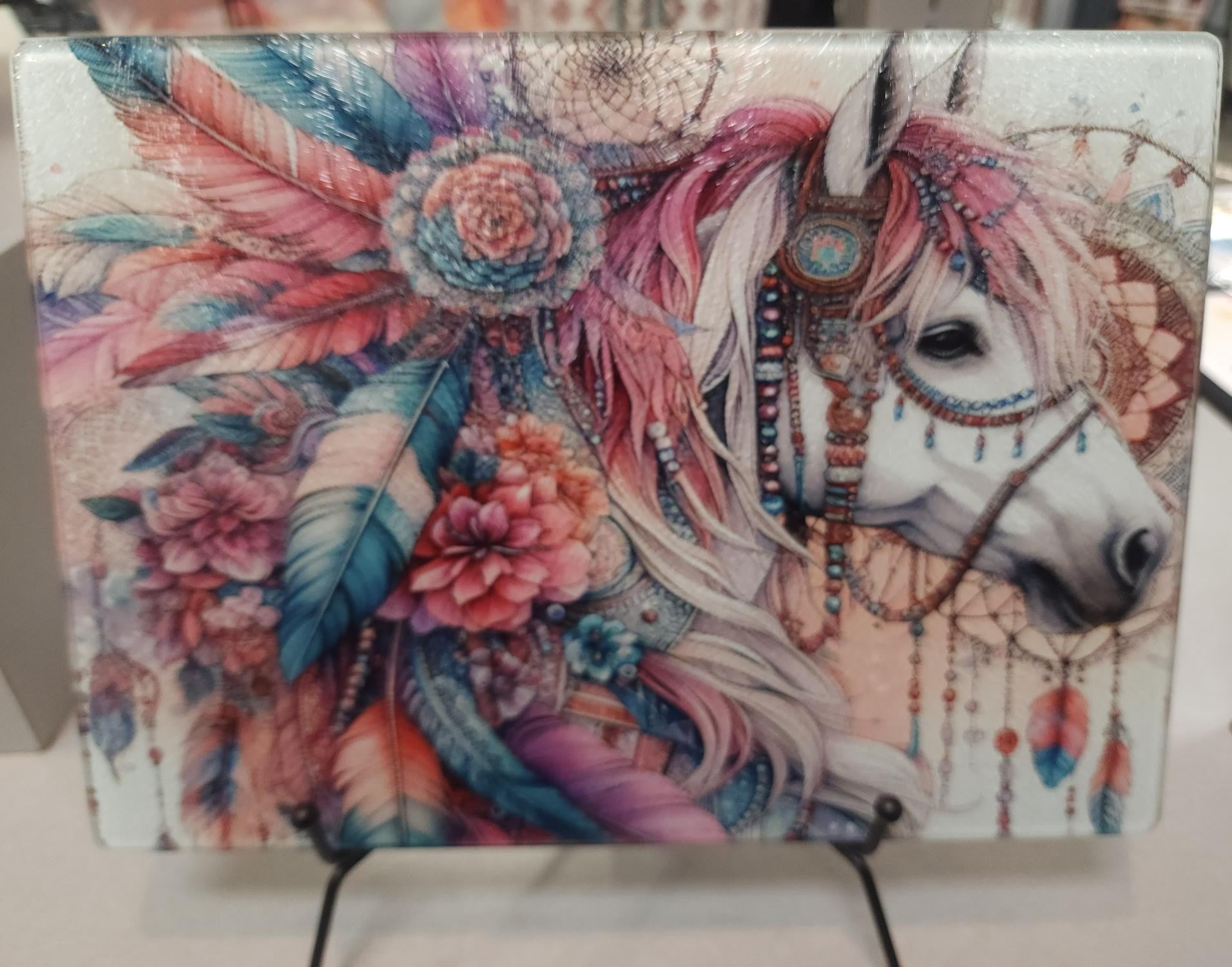Watercolor Feather Horse Sublimated Glass Cutting Board - Premium Durability & Vibrant Designs